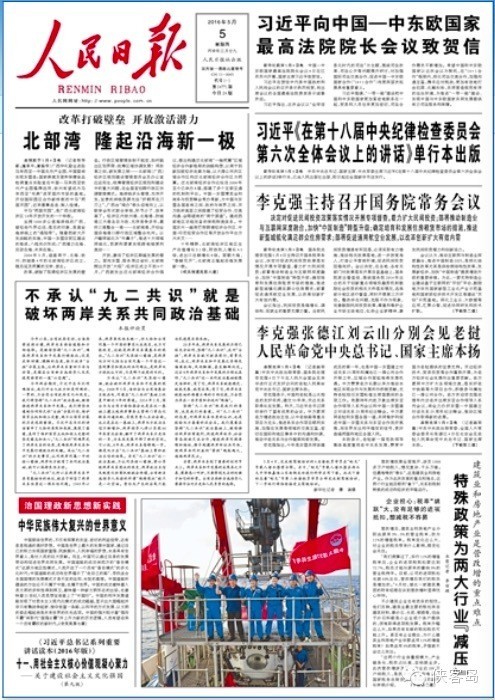有意思的是,蔡英文勝選后即接受偏藍的《聯合報》專訪(而非偏綠的《自由時報》之類),專門談到兩岸關系,要求大陸多釋放一些善意。而心領神會的《聯合報》立馬摘編出來,放在頭版頭條足量處理,向對岸遞話的意圖活生生刻在臉上。如今5·20沒幾天了,大陸黨報頭版外加由4日晚的《新聞聯播》和新華社提前報道,三架馬車式的高規格大陣仗強力度,自然某種程度上給足了相關人員面子——正所謂來而不往非禮也。
