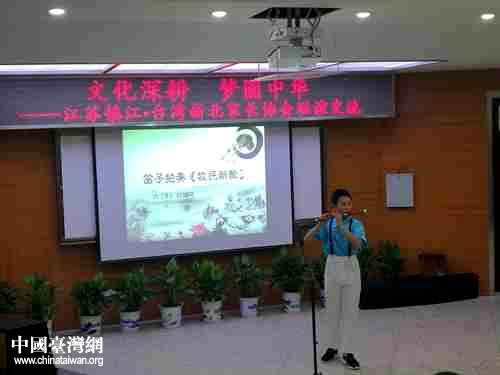 鎮(zhèn)江中華路小學(xué)生在交流會上展示笛子演奏。(鎮(zhèn)江市臺辦 章邦勇 攝)