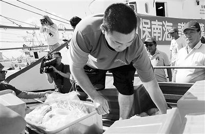 臺灣漁民駕船自費往返太平島,帶回島上的淡水和椰子,向世界證明祖先留下的太平島是島不是礁。圖為7月20日漁民在出行前為船只補充給養。