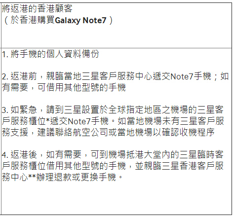 香港三星表示,對(duì)于香港民航處最近要求乘客不要于來(lái)往香港的航班上攜帶Galaxy Note7,三星電子香港已經(jīng)采取應(yīng)對(duì)措施,于香港國(guó)際機(jī)場(chǎng)設(shè)立客戶服務(wù)柜位,為所有香港及身處香港的Galaxy Note7外國(guó)顧客提供緊急協(xié)助。所有Galaxy Note7的顧客在登機(jī)前,應(yīng)將手機(jī)交予當(dāng)?shù)氐娜强蛻舴⻊?wù)中心,或當(dāng)?shù)貦C(jī)場(chǎng)內(nèi)的三星客戶服務(wù)柜位、航空公司或機(jī)場(chǎng)保安,并從他們獲取證明文件,在返回原居地后,以便三星協(xié)助跟進(jìn)。
