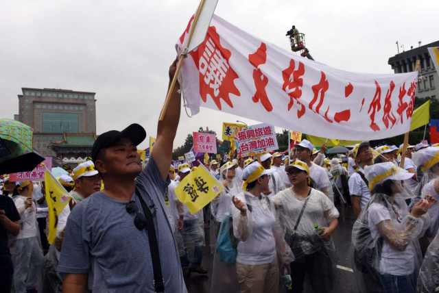 臺(tái)灣觀(guān)光業(yè)者舉行抗議活動(dòng),批評(píng)民進(jìn)黨當(dāng)局拒不承認(rèn)“九二共識(shí)”,導(dǎo)致兩岸關(guān)系轉(zhuǎn)冷,造成大陸來(lái)臺(tái)游客銳減,直接影響島內(nèi)觀(guān)光業(yè)界的生計(jì)。(宋振平攝)