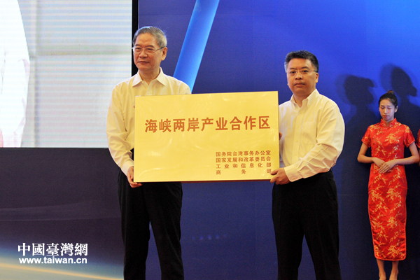 開(kāi)幕式現(xiàn)場(chǎng),張志軍為海峽兩岸產(chǎn)業(yè)合作區(qū)(湖北)授牌。(圖片來(lái)源:湖北省臺(tái)辦)