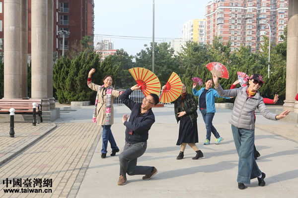 兩岸記者與陽春新紀元里的大媽一起跳廣場舞《中國范兒》。(中國臺灣網 陳佳慧 攝)