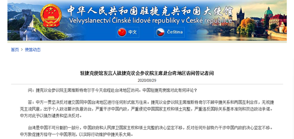 駐捷克使館發言人就捷克議會參議院主席赴臺灣地區訪問答記者問。(中國駐捷克大使館網站截圖)