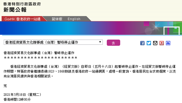 港府公報(bào):香港經(jīng)濟(jì)貿(mào)易文化辦事處(臺(tái)灣)暫時(shí)停止運(yùn)作