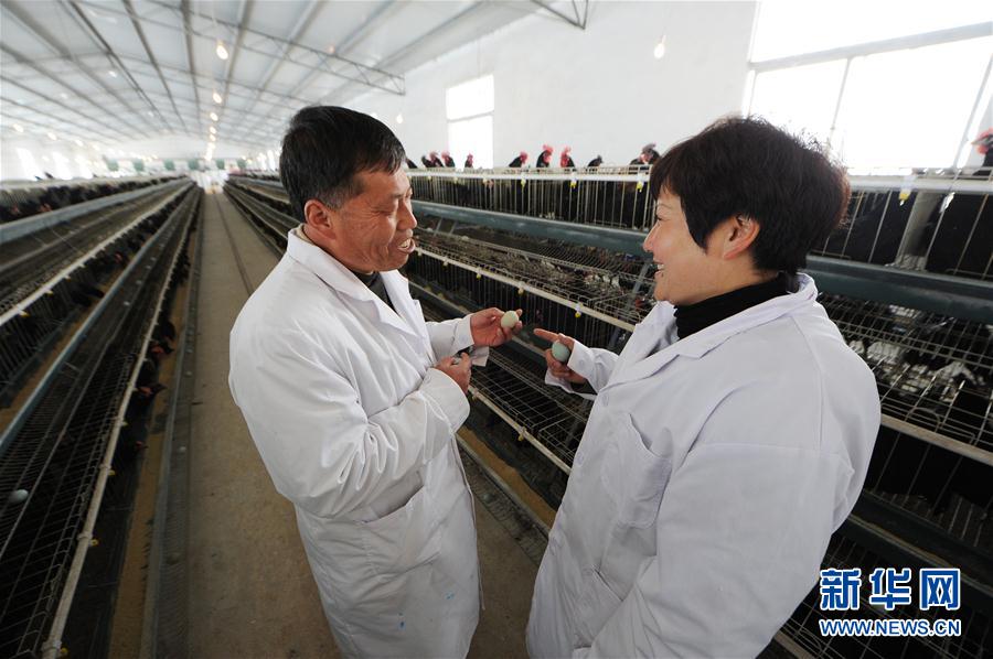 余留芬(右)在巖博村種雞養殖場向工作人員了解養殖場生產情況(2014年1月14日攝)。新華社記者 陶亮 攝