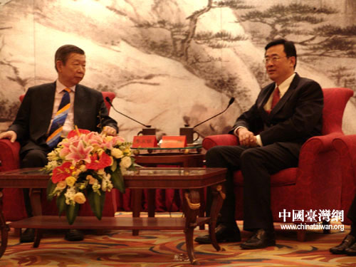 中國統(tǒng)促會執(zhí)行副秘書長李路(右)與蔡友鐵(左)團長親切交談