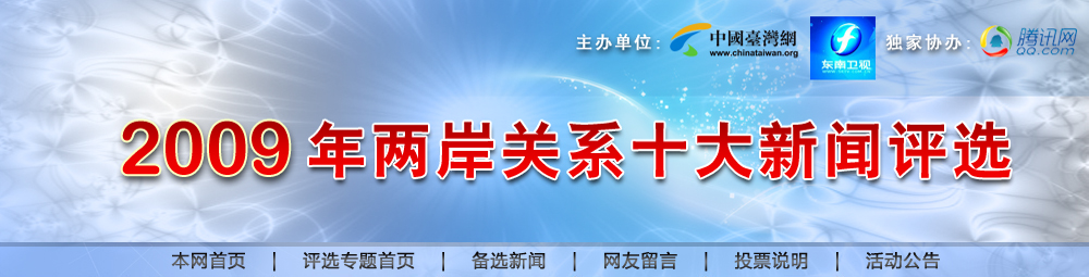 中國臺灣網(wǎng)12月31日北京消息 由中國臺灣網(wǎng)攜手福建東南衛(wèi)視主辦,騰訊網(wǎng)獨(dú)家協(xié)辦的“2009年兩岸關(guān)系十大新聞”評選活動今天正式啟動。
