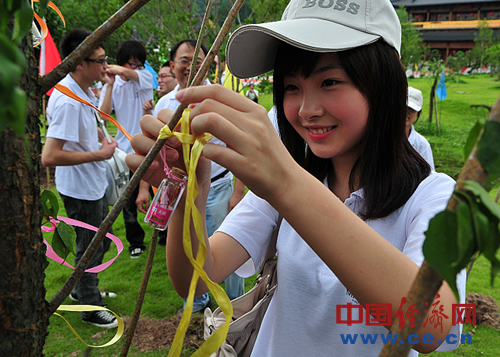 這是“同根同源共享世博” 2010(奉化)海峽兩岸青年尋根祈福之旅活動(dòng)的內(nèi)容之一。作為“2010中國(guó)(奉化)雪竇山彌勒文化節(jié)”的重要組成部分,2010(奉化)海峽兩岸青年尋根祈福之旅豐富多彩。7月16日晚上,百余名兩岸青年齊赴雪竇山參加彌勒文化節(jié)活動(dòng),觀看了精彩隆重的開幕式暨“應(yīng)夢(mèng)雪竇”大型梵唄音樂盛典;7月17日上午,先后參觀露天彌勒大佛景區(qū)、蔣氏遺跡、滕頭村等,許多臺(tái)灣青年對(duì)全球坐姿最高的銅制露天彌勒大佛、生態(tài)環(huán)境優(yōu)美的滕頭村和修繕完好的蔣氏遺跡贊嘆不已。兩岸青年還在大佛景區(qū)內(nèi)共同種植了友誼樹,并把各自寫好的心愿放進(jìn)許愿瓶?jī)?nèi)掛在了樹上,共同祈福祖國(guó)繁榮昌盛。