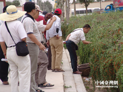 7月10日,在寧夏參加“海峽兩岸記者聯(lián)合采訪活動(dòng)”的兩岸記者一行參觀采訪中寧縣萬畝枸杞園。