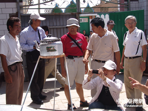 記者們對當地使用的太陽能熱水壺產生興趣