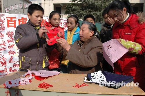 1月6日,河南省南陽市臥龍區(qū)陸營鎮(zhèn)一中退休教師呂登閣和學(xué)生們一起創(chuàng)作剪紙作品《百虎迎春》,迎接即將到來的農(nóng)歷虎年。