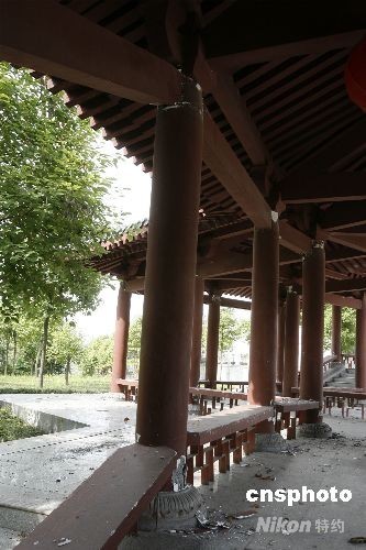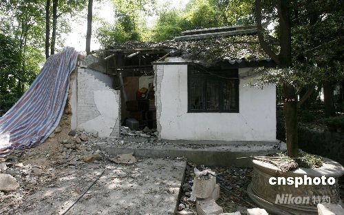 六月五日,四川江油李白故里被損壞的梁柱。受汶川地震影響,江油李白故居房屋全部拉裂,部分垮塌,清代建筑幾乎全部倒塌。有關(guān)文物部門初步估算,修復(fù)李白故里的費用可能達到三千萬至五千萬元人民幣。 中新社發(fā) 慎重 攝