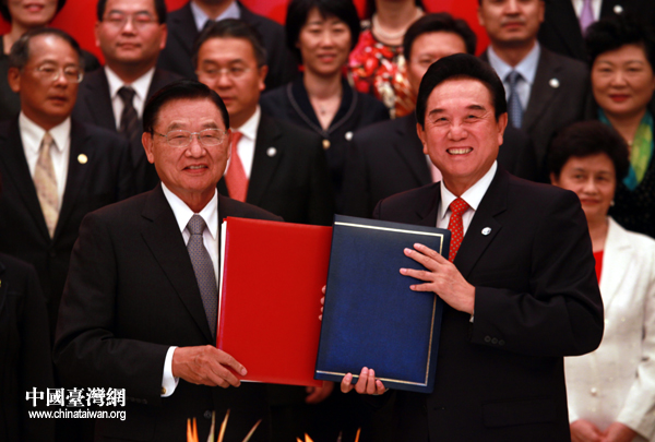 6月29日下午,海協會與臺灣;鶗谥貞c申基索菲特大酒店,舉行兩岸經濟合作框架協議(ECFA)以及兩岸知識產權保護合作協議簽字儀式。圖為海協會會長陳云林和;鶗麻L江丙坤分別在協議書上簽字。(中國臺灣網 鐘寶華 攝)