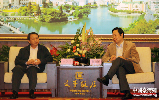 11月6日下午,南通市委常委、常務(wù)副市長藍紹敏(右)會見了前來采訪的兩岸媒體“江蘇沿海行”記者。(中國臺灣網(wǎng) 王偉 攝)
