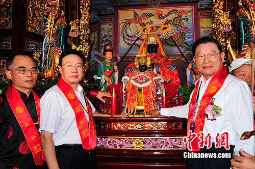 前來參加今天儀式的全國臺灣同胞投資企業聯誼會會長郭山輝在接受采訪時表示,在臺商聚集的昆山舉行媽祖廟安座大典,可以拉近兩岸距離,加深兩岸人民深厚感情,讓媽祖文化在兩岸傳遞。