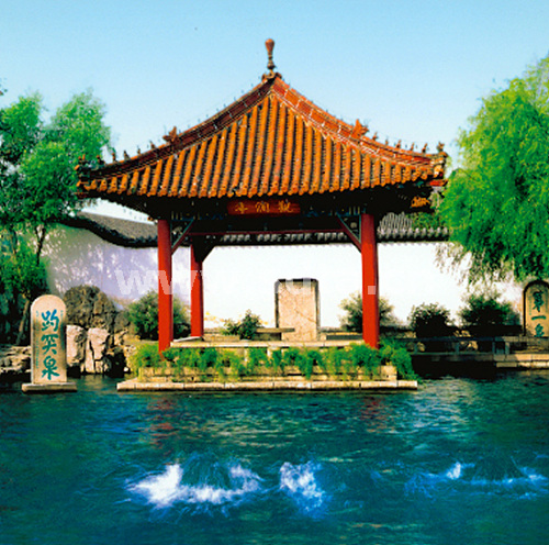 趵突泉北岸有一組較大的古建筑群,通稱三大殿。最南大殿“濼源堂”,三間兩層,歇山飛檐,古色古香,建于北宋年間,挹廈柱上,刻著元代文學家趙孟頫的著名詩句:“云霧潤蒸華不注,波濤聲震大明湖!弊煮w雄渾有力,詩句生動傳神,恰與眼前的波光水影交相輝映。殿堂后面還有兩座大殿,原寫“娥姜祠”,現寫“娥英祠”,后人為贊頌舜的兩位妃子娥皇、女英而建祠,以志紀念。在三大殿院內的花格透墻上,鑲嵌著30余方石刻,都是歷代名人的佳作詩篇。特別值得一提的是院內的那尊罕見的“雙御碑”,記載著康熙三臨、乾隆二臨趵突泉的題詞詩文,標示著趵突泉的地位。趵突泉以南石灣泉處的白雪樓,是為紀念明朝文學家、后七子領袖李攀龍所建,原樓毀于一旦,1996年在原址重新修建與白雪樓連為一體的戲劇大舞臺,于同年建成。這里常年舉辦以京劇為主的各種戲劇演出,已成為全國乃至世界知名的演出活動中心。趵突泉東南處的滄園據說是李攀龍曾讀書的地方,院內三廳兩院,外廊環(huán)繞,曲廊相圍,院中奇花異木,蒼松滴翠,當代著名花鳥畫家王雪濤紀念館1987年建于此處,200余件繪畫常年陳列展出。步出滄園,跨過楓溪島小橋,東北方向不遠處一泓碧水,從地面涌出似一面明鏡,這便是七十二名泉中的漱玉泉,泉邊緣柳成蔭,泉水清澈見底,水石相激,淙淙有聲,猶如漱玉。