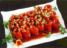 色澤紅潤,質(zhì)地軟嫩,兼有酸,甜,香,辣,咸五味,鮮香味美,異常適口。