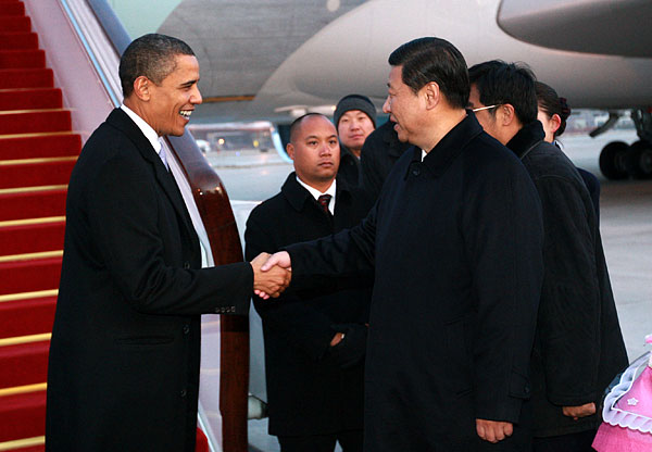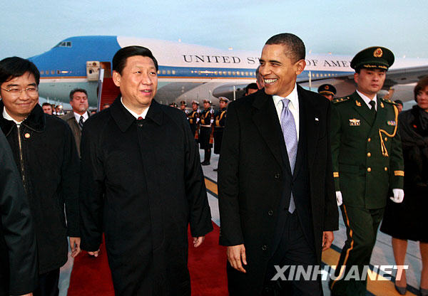 11月16日下午,美國總統奧巴馬乘專機從上海飛抵北京,國家副主席習近平前往北京首都國際機場迎接。新華社記者 龐興雷 攝