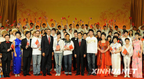11月17日晚,國家主席胡錦濤在北京人民大會堂舉行宴會,歡迎來華訪問的美國總統(tǒng)奧巴馬。這是胡錦濤和奧巴馬同在宴會上表演精彩文藝節(jié)目的藝術(shù)家和中美大學(xué)生一起合影。新華社記者黃敬文攝