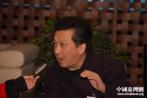在駐地酒店一層大廳里,著名歌手郁鈞劍正在聚精會神地回答記者提問。