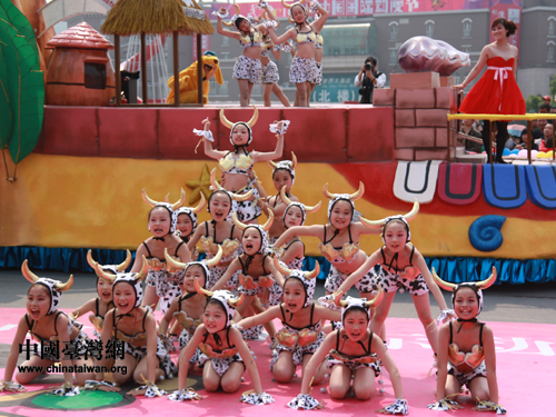 普達海文化創意彩車巡游,小學生扮演的小牛精神抖擻(中國臺灣網 李丹 攝)