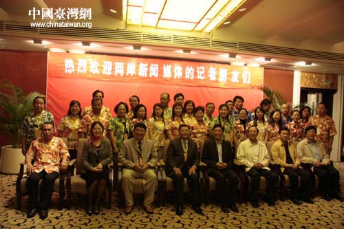 中國臺灣網11月29日海口消息 “兩岸媒體海南行”采訪活動28日在海口正式啟動。兩岸共有40余名記者參加了此次活動,其中臺灣12家媒體的24名記者全部來自臺灣南部。圖為臺灣記者身穿被海南人冠以“島服”名稱的海島旅游休閑服與海南省有關領導合影。(李杰)