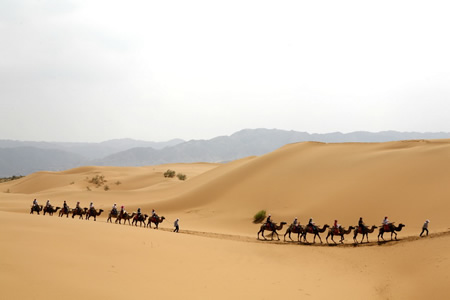 “大漠孤煙直長河落日圓”這句描述塞外奇特壯麗風(fēng)光的千古絕句流傳世代,7月1日,“塞上江南和諧家園”全國網(wǎng)絡(luò)媒體寧夏行采訪團來到沙坡頭,看著浩瀚無邊的邊疆大漠,感受著西域獨特的風(fēng)情。 記者 張茂 攝