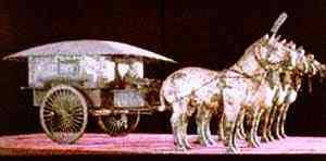 陵墓地宮中心是安放秦始皇棺槨的地方,陵墓四周有陪葬坑和墓葬400多個,范圍廣及56.25平方公里。主要賠葬坑有銅車、馬坑、珍禽異獸坑、馬廄坑以及兵馬俑坑等,歷年來已有5萬多件重要歷史文物出土。1980年發(fā)掘出土的一組兩乘大型的彩繪銅車馬--高車和安車,是迄今中國發(fā)現(xiàn)的體形最大、裝飾最華麗,結構和系駕最逼真、最完整的古代銅車馬,被譽為“青銅之冠”。