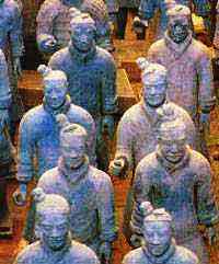 1974年以來,在陵園東1.5公里處發(fā)現(xiàn)從葬兵馬俑坑三處,成品字形排列,面積共達2萬平方米以上,出土陶俑8000件、戰(zhàn)車百乘以及數(shù)萬件實物兵器等文物; 其中一號坑為“右軍”,埋葬著和真人真馬同大的陶俑、陶馬約6千件; 二號坑為“左軍”,有陶俑、陶馬1,300余件,戰(zhàn)車89輛,是一個由步兵、騎兵、戰(zhàn)車等三個兵種混合編組的曲陣,也是秦俑坑的精華所在; 三號坑有武士俑68個,戰(zhàn)車1輛,陶馬4匹,是統(tǒng)帥地下大軍的指揮部。這個軍陣是秦國軍隊編組的縮影。 1980年又在陵園西側出土青銅鑄大型車馬2乘。引起全世界的震驚和關注, 這些按當時軍陣編組的陶俑、陶馬為秦代軍事編制、作戰(zhàn)方式、騎步卒裝備的研究提供了形象的實物資料。 兵馬俑的發(fā)現(xiàn)被譽為“世界第八大奇跡”,“二十世紀考古史上的偉大發(fā)現(xiàn)之一”。秦俑的寫實手法作為中國雕塑史上的承前啟后藝術為世界矚目。現(xiàn)已在一、二、三號坑成立了秦始皇陵兵馬俑博物館, 對外開放。